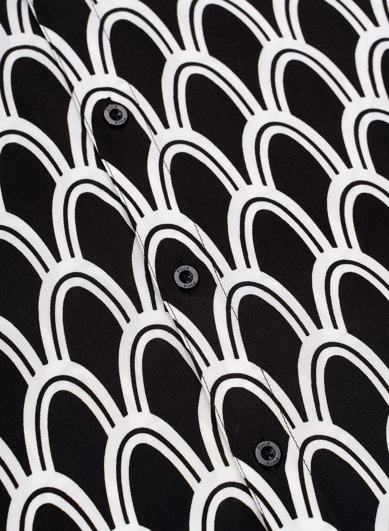 A captivating tribute to the iconic Art Deco era. Crafted from smooth black viscose fabric, this shirt showcases a mesmerising arch geometric print that embodies the sophistication and allure of the period. Exclusively PHIX, this print has been designed and created in-house for a truly bespoke look and features all our signature tailoring hallmarks including a pointed collar, slim fit silhouette and monogram embossed buttons.