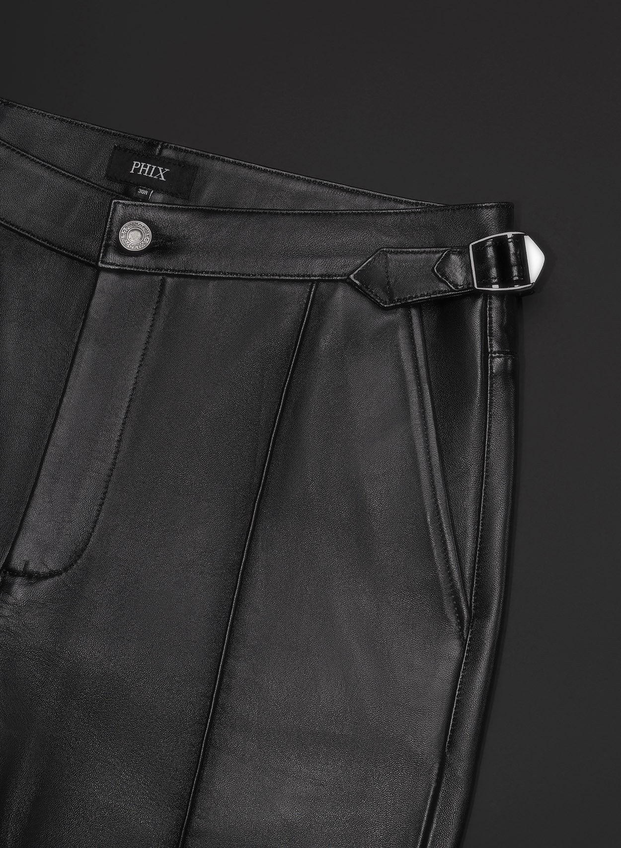 Crafted with meticulous attention to detail, these black lambskin leather trousers feature sophisticated side waist buckle detailing in a polished silver tone and pleats. Complete with a wide-leg flared silhouette, effortlessly combining classic style with contemporary refinement. Designed to be worn high-waisted, the waist straps assist with obtaining the perfect fit.