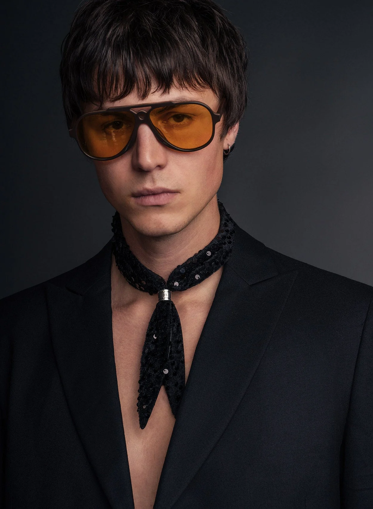 Crafted with meticulous attention to detail, this black neck scarf features a subtle yet striking sequin pattern that adds a touch of understated glamour to your ensemble. The piece features pointed ends and is complemented by a gunmetal-tone ring tie, beautifully embossed with our monogram, offering both functionality and a bespoke touch. Also available in red.