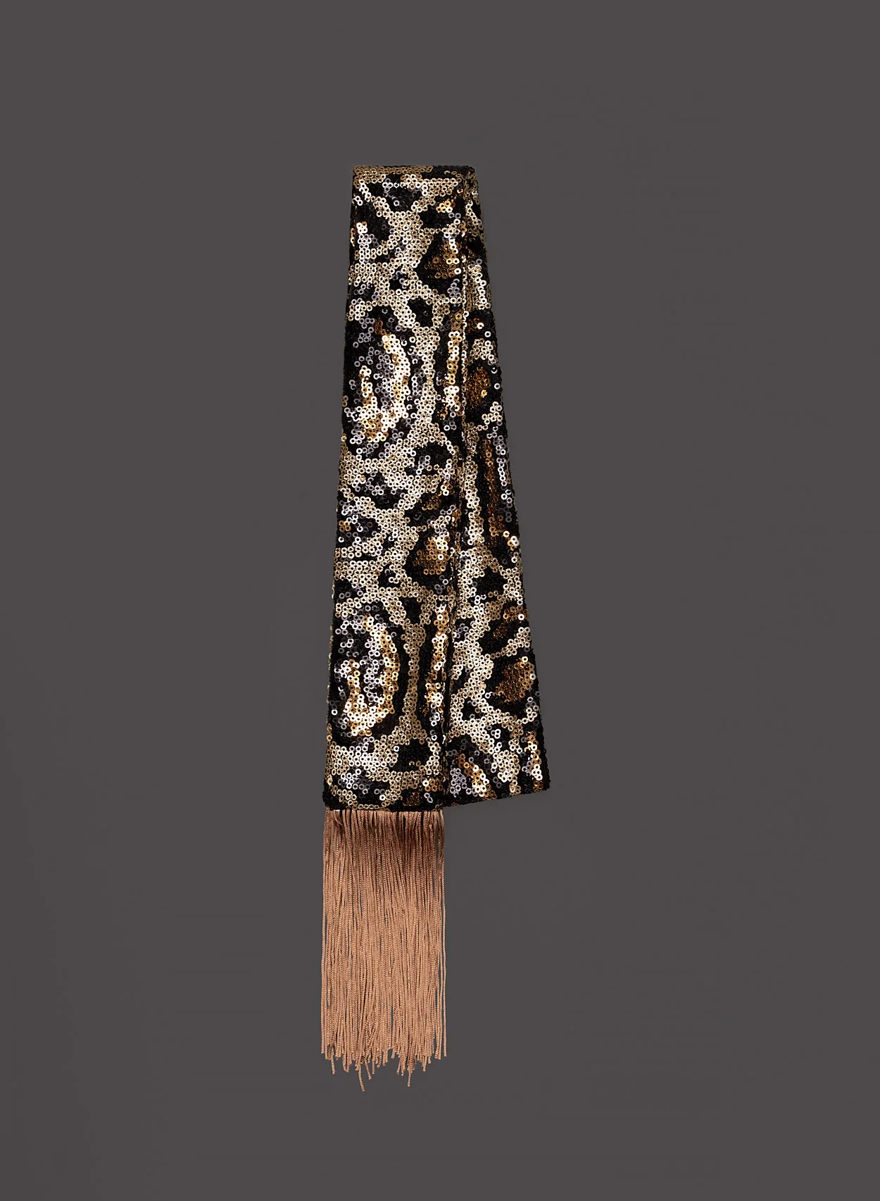 This sequin scarf features a bold leopard-inspired design in gold, black, and bronze tones, creating a striking statement piece. The shimmering sequins catch the light beautifully, while the soft tassel fringe adds a touch of elegance and movement. Perfect for evening wear or standout styling.