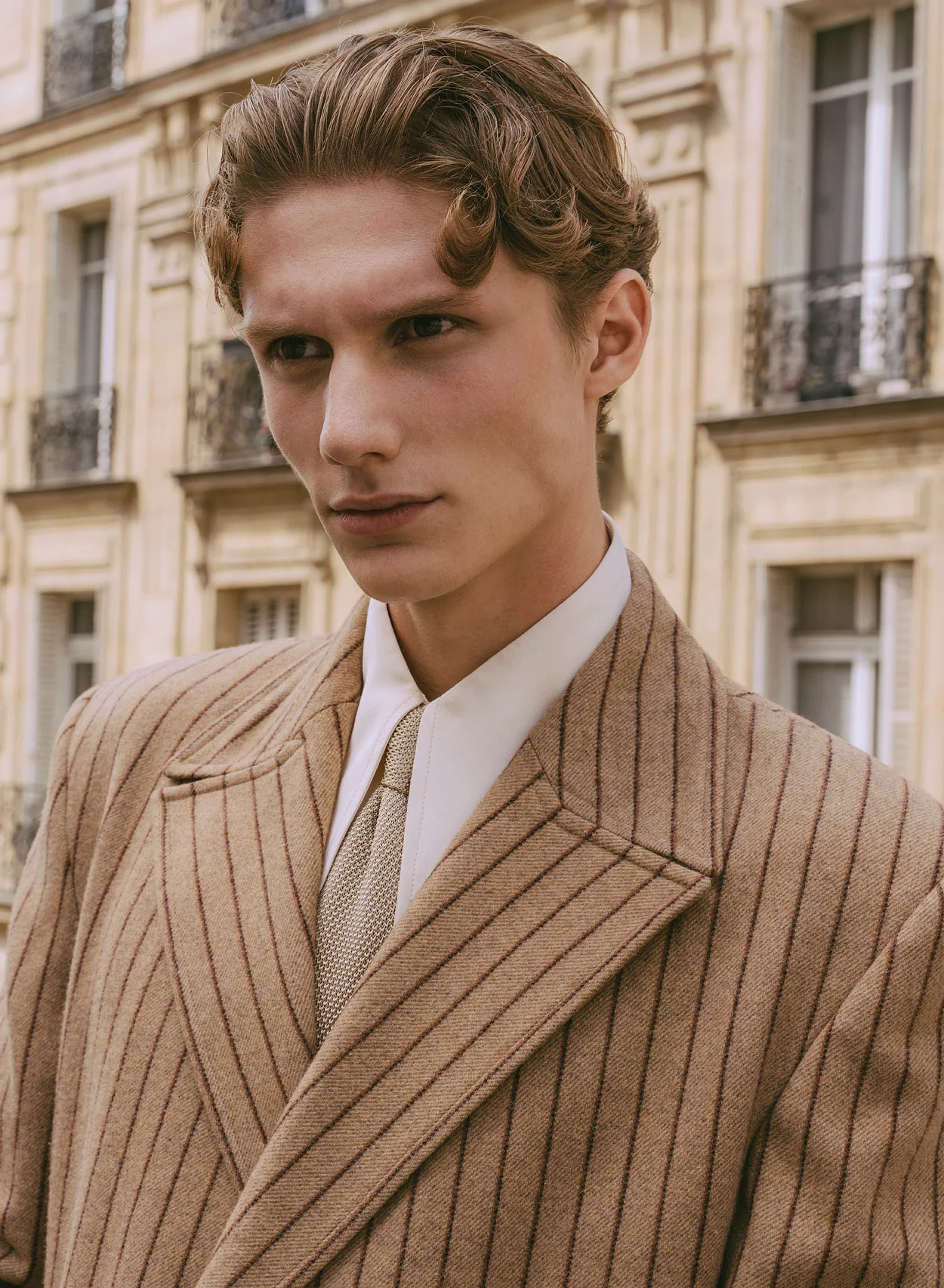This refined longline wool overcoat is designed to create a striking and sophisticated silhouette, defined by its double-breasted construction and a camel beige colour accented with subtle burgundy pinstripes. A distinctive large lapel and exaggerated shoulders contribute to its elegant, structured aesthetic. The adjustable waist tie allows for versatile styling to define the figure, making it a versatile addition to any wardrobe. Also available in charcoal black.
