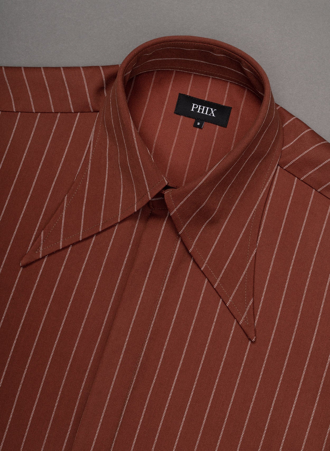 This orange shirt features a sharp, elongated dagger collar, bringing a refined edge that blends modern sophistication with classic tailoring. Fine pinstripes accentuate the structured design, adding depth and definition. Finished with three-button barrel cuffs and a concealed button closure, every element is thoughtfully crafted for a sleek and distinguished look.