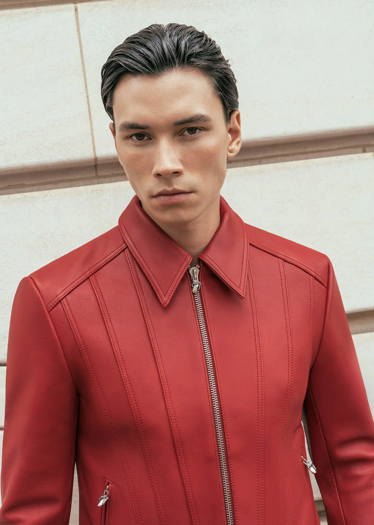 This distinctive red leather jacket from the official Phix x Rolling Stones collection combines clean lines with bold detailing. It features a sleek full-zip front and sharp panel stitching, creating a structured and tailored appearance. The back is uniquely detailed with the iconic Rolling Stones embossed tongue logo, offering a refined touch. Custom zip pulls further enhance the design of this exclusive piece.
