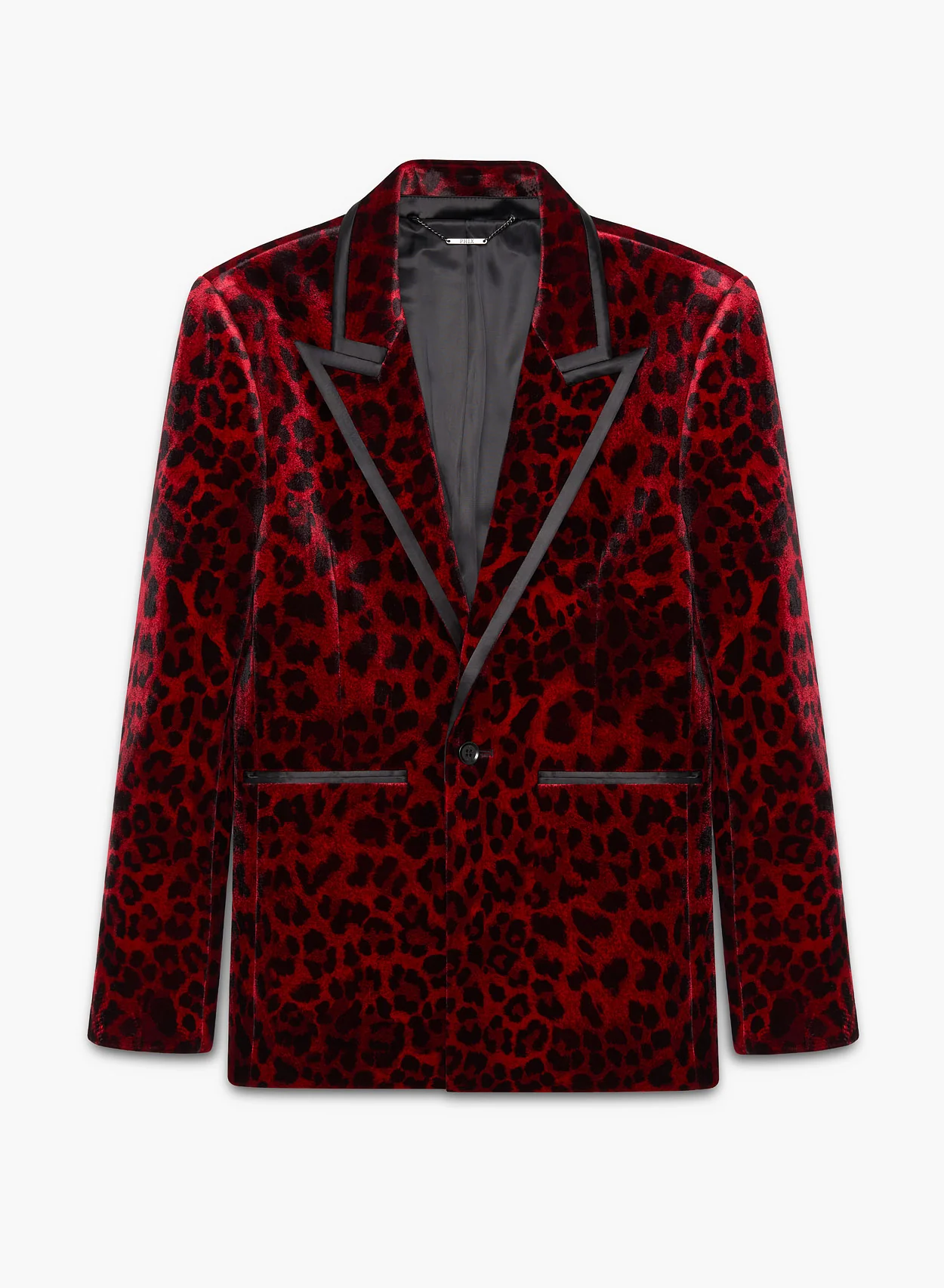 A statement in print and texture. This single-breasted velvet suit blazer is defined by a bold leopard print on a rich red velvet. Crafted from a premium velvet, it provides a luxurious feel and a sleek, tailored silhouette. Finished with satin lapel piping for subtle textural contrast, the distinctive print ensures a refined presence, making this blazer a considered piece for any elevated evening wear.