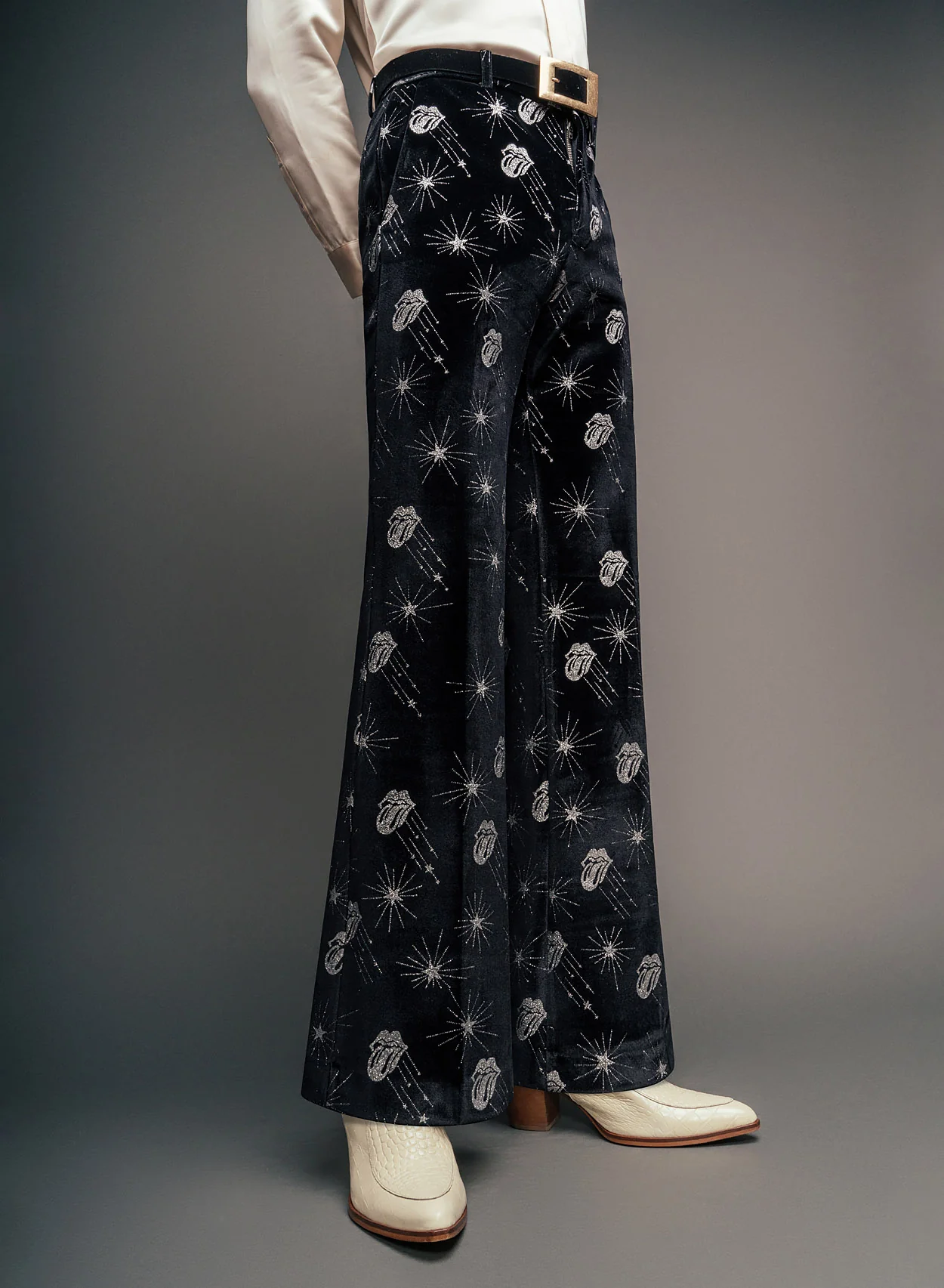 These black velvet trousers embody 70s-inspired sophistication with a bold Rolling Stones design. Crafted from luxurious velvet, they feature shimmering starburst details paired with the iconic Rolling Stones tongue logo.