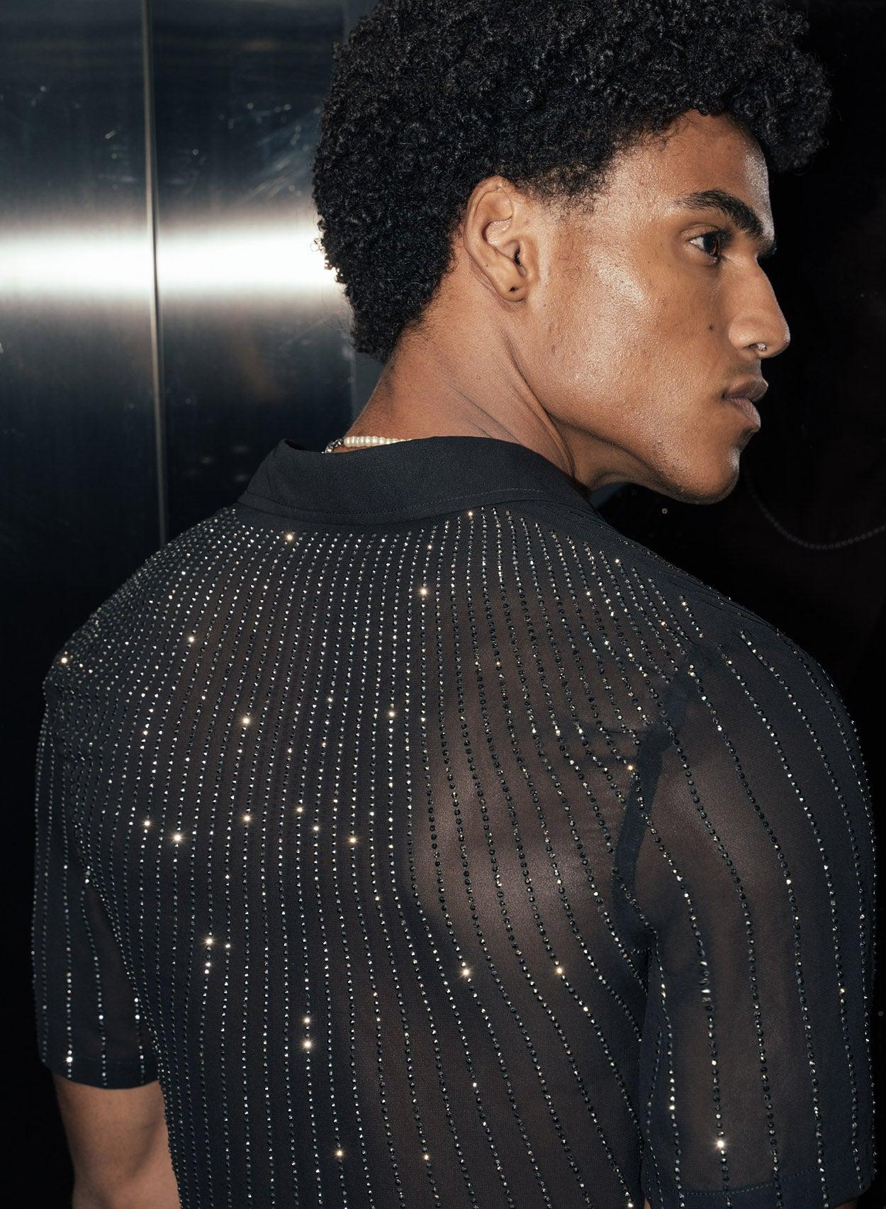 Standout and make a statement with the Short Sleeve Sequin Chiffon Shirt, cut from smooth semi-sheer dark chiffon. This shirt features a pointed collar and a short-sleeved silhouette, intricately embroidered with rhinestone crystals in a linear pattern. Subtle black-logo embossed buttons add a touch of elegance, completing the look.