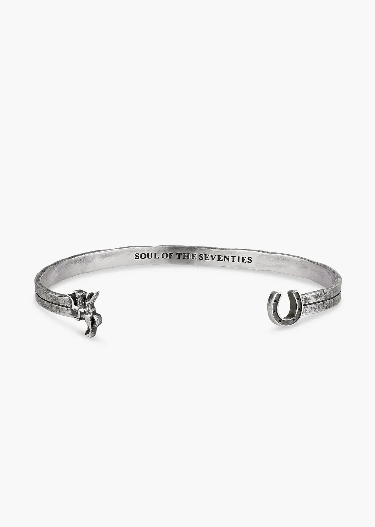 A fusion of rock and rodeo, this open bangle features a sculpted rider figure on a rearing horse at one end and a classic horseshoe at the other. The band's rough, textured surface is finished with a deep aged silver patina that enhances the piece's character and detail. The interior is engraved with "SOUL OF THE SEVENTIES" and the PHIX logo. Handcrafted from silver-plated in India.