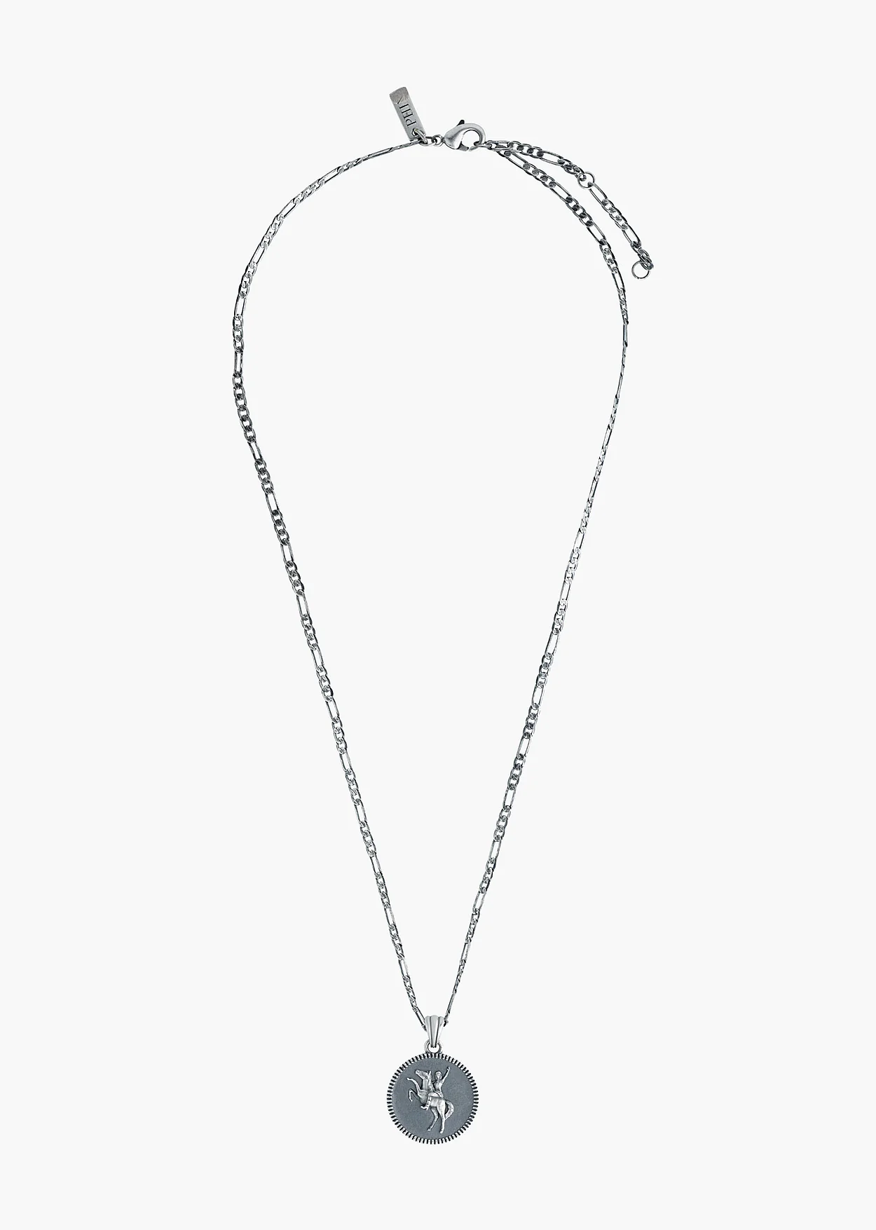 A classic medallion with a relief design, this pendant features a highly detailed motif of a rider on a rearing horse. The central figure is framed by a textured, coin-edge border and finished with a deep oxidised patina that highlights the carving. The pendant is suspended from a sharp, figaro chain, providing a confident contrast in texture and style. Handcrafted, silver-plated in India and engraved with the PHIX logo on the reverse side.