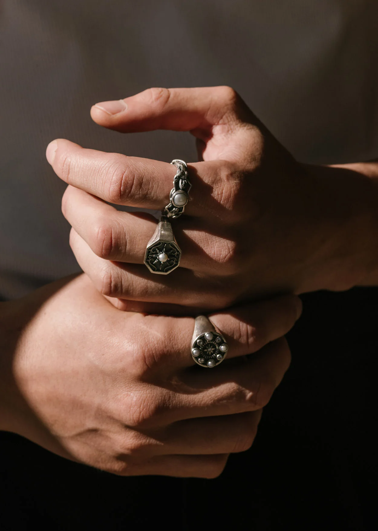 This signet-style ring features an octagonal face engraved with a starburst design, centred around a smooth pearl cabochon. The oxidised, aged silver finish accentuates the raised pattern, giving the ring depth, texture, and contrast. Crafted with silver-plate, engraved with the PHIX logo, and handcrafted in India, it balances refinement and edge, a statement piece with understated power.