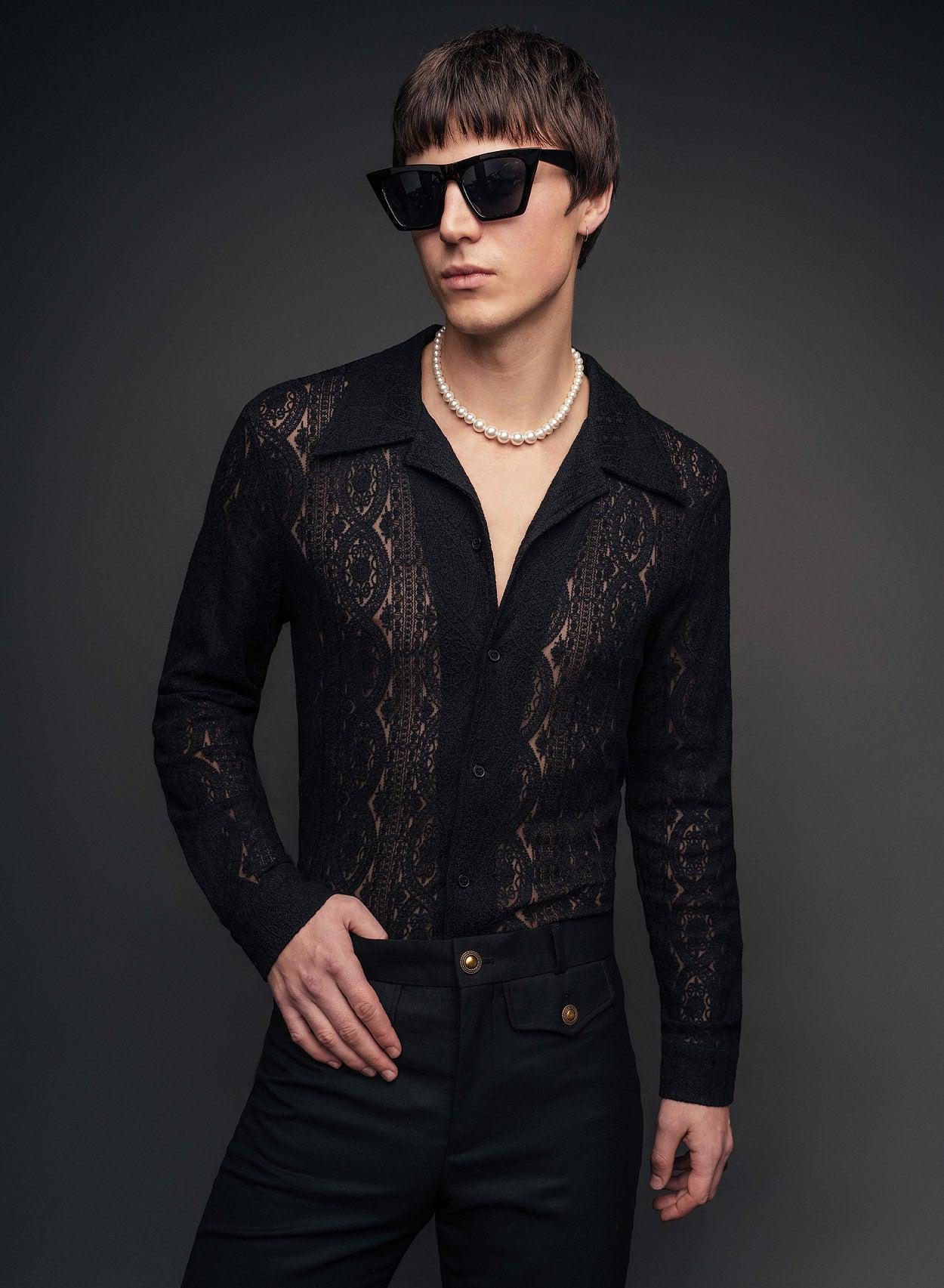 Crafted with precision, the Western Black Lace Embroidery Shirt is cut for a tailored silhouette and features intricate semi-sheer lace adorned with an ornate print. Complemented by monogrammed black buttons and a statement collar, this shirt is finished with a striking western-style single-point back yoke detail for a bold and sophisticated look.